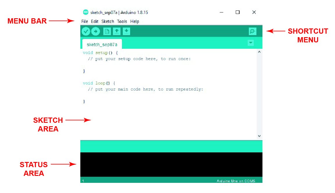 The Arduino IDE consists of a menu bar, a shortcut menu, a control program area, and a program status area. The program can upload data to the Arduino board and contact directly. In programming the control program of Arduino IDE, we will call it Sketch. By writing this Sketch, it is written in the form of text and saved as a file with the extension ino, which we can write, delete, search and change the text.