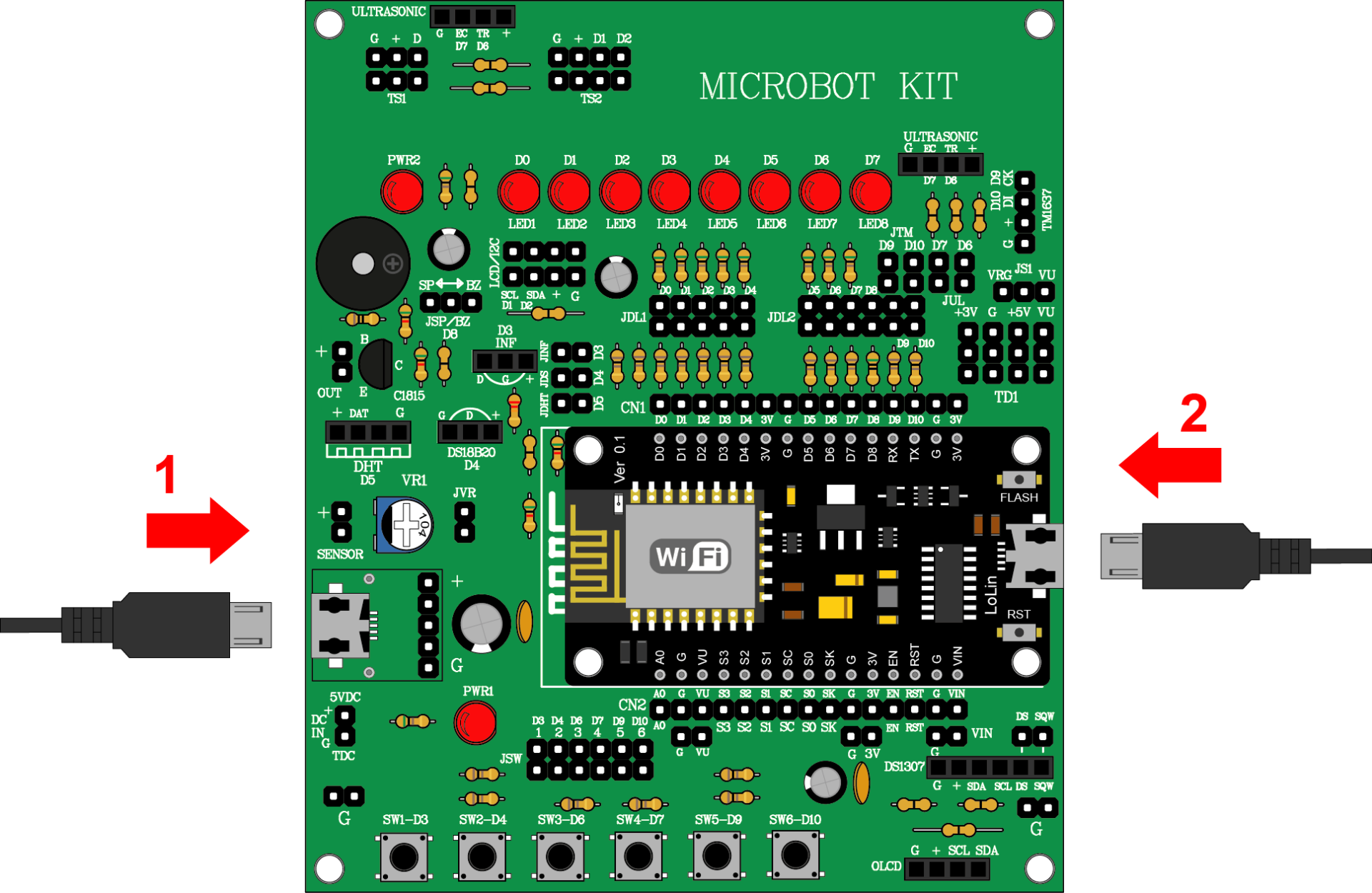STEP 1 Supply 5VDC power to position 1 as shown in the figure, and then connect the USB cable that comes from the computer in position 2.